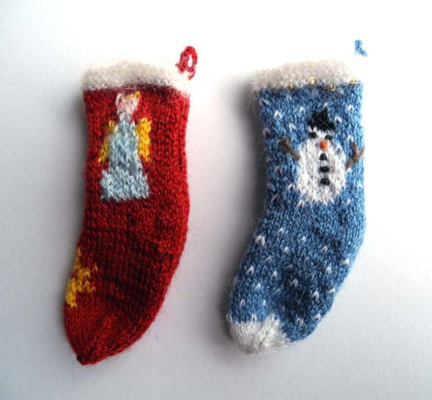 Knitted red Christmas stocking with a white mohair collar. The lovely angels and star are knitted in. Length 6 cm. This stocking has a red crocheted strap.