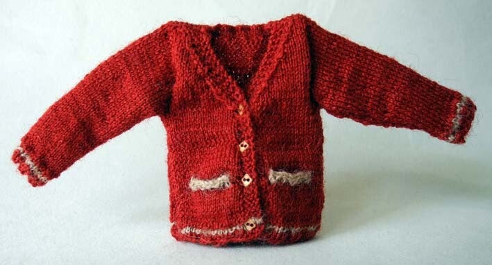 This comfortable woollen cardigan fits a man so well as a woman. It has real pockets and nice working wooden buttons. Seize: width 4 cm, height 5.4 cm.