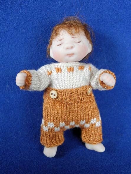 Een schattig ouderwets knooppakje. Trui en broek zijn met knopen vastgemaakt. De kleine vierkantjes zijn ingebreid. Het truitje is aan de achterkant gesloten. Deze naad kan opengemaakt worden om het aan te trekken. Met het pakje stuur ik wat garen in dezelfde kleur om daarna de sluiting weer dicht te maken. Als u wilt kan ik de achternaad voor u open maken. Alleen het gebreide pakje, niet de pop.