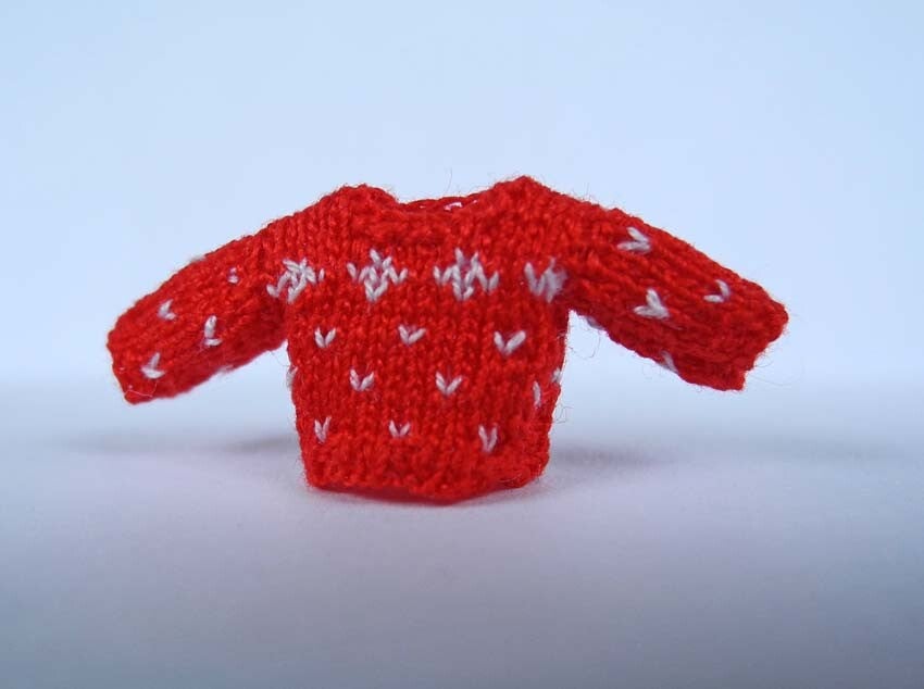 A beautiful Norwegian jumper with knitted motifs on the front and back. This jumper is hand knitted with thin cotton on 0.6 mm needles. Length 12mm. Scale 1-48. With every item 1-48 comes a free cloth hanger.