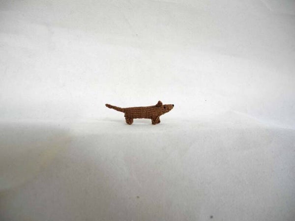 Isn't he super sweet, this knitted dachshund? I love dachshunds. The nice thing is that it can stand independently. He is 3 cm. long (without tail) Will you take good care of him?