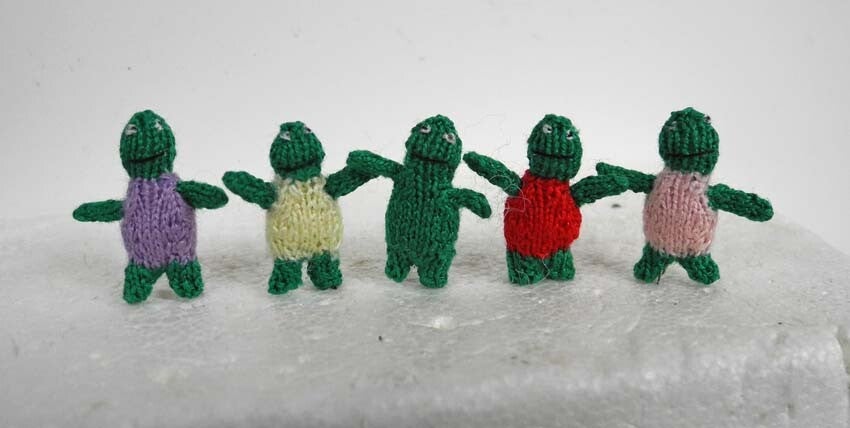 A cute little baby frog, only 2 cm. big. The other members of the frog family are 3 and 3.5 cm in size. A sweet cuddly toy in small children's hands.