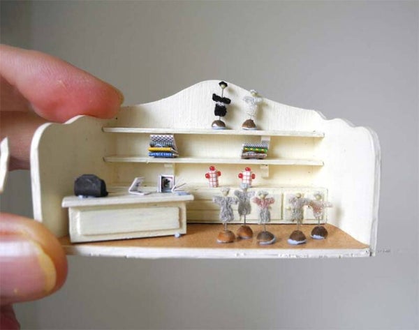 Incredibly small micro knit. The dress is knitted on 0.4 mm knitting needles. and with pink and green cotton no. 80. The hat is crocheted with a 0.4 mm crochet hook. It stands on a wooden stand. Various books and magazines at home and abroad have written articles about my micro knitting. Length dress 5 mm.