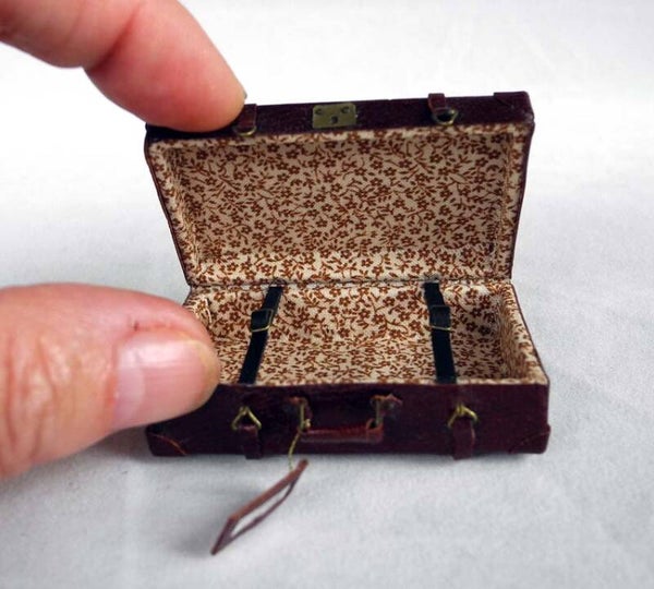 Prachtige koffer gemaakt van mooi dun leer. Veel details zoals riemen die open en dicht kunnen, een plaatje voor een sleutel, een adreslabel en leren beschermhoeken. In de binnenkant is een mooi stofje en er zijn leren riemen. Afm. 5,4 x 3,5