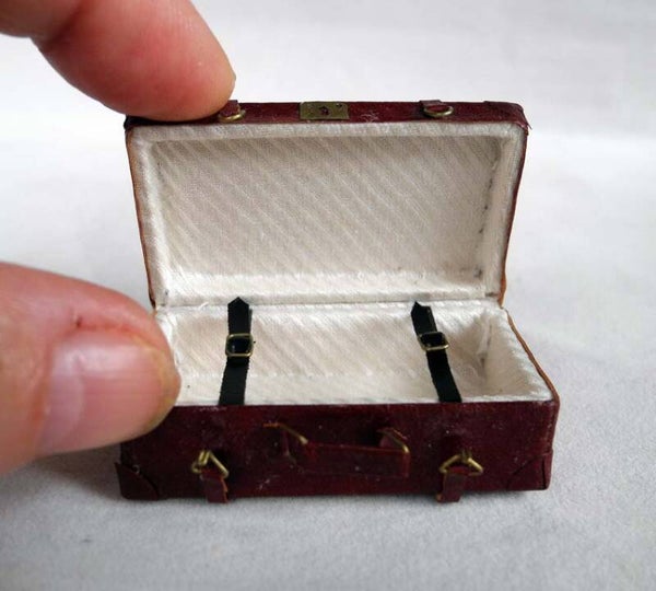 Prachtige koffer gemaakt van mooi dun leer. Veel details zoals riemen die open en dicht kunnen, een plaatje voor een sleutel en leren beschermhoeken. In de binnenkant is een mooi stofje en er zijn leren riemen. Afm. 4,8 x 3 cm
