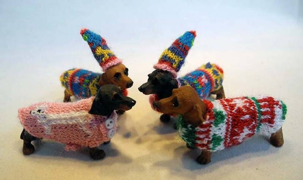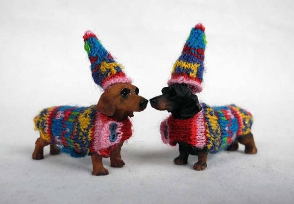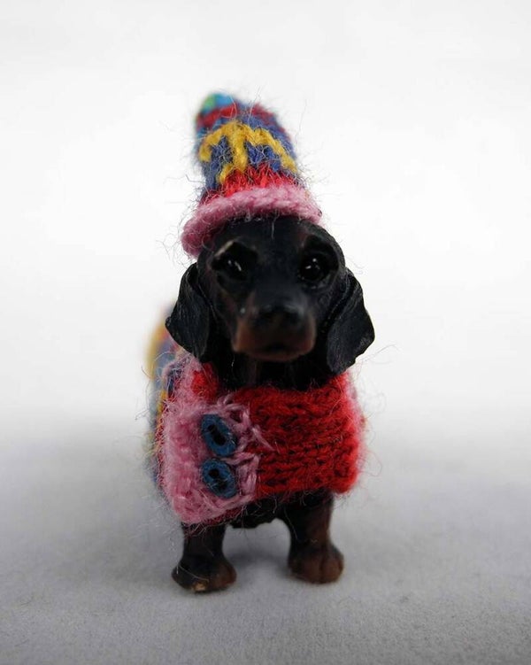 The most beloved dachshund coat! This makes you happy. The beautiful dachshund was made by the Ott company and is unfortunately no longer made. The coat and party hat are knitted with very thin wool. All patterns are completely knitted in. The dachshund is 5 cm long.