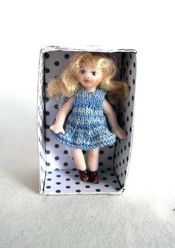 A cute porcelain doll with beautiful long blond hair. She is wearing a lovely knitted dress of thin blue cotton in different shades. And also a knitted woolen panty. This doll is 4.5 cm long.
