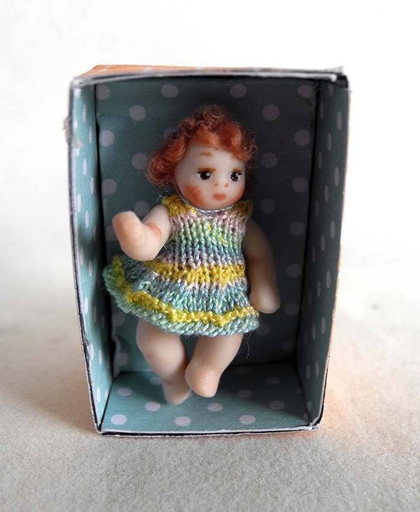 A cute porcelain doll with a lovely face. She is wearing a lbeautifully knitted dress of thin cotton in different pastel colours. And also a knitted woolen panty. This doll is 3.5 cm long.