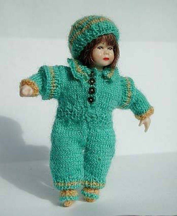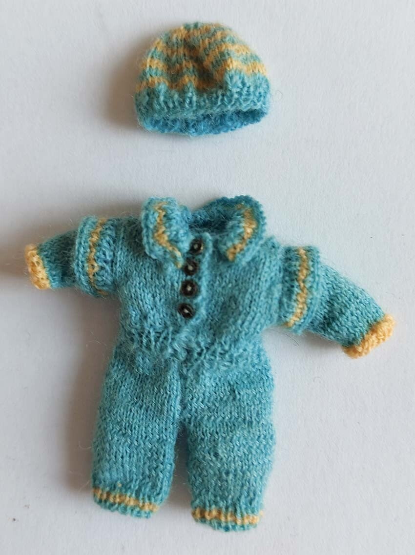 A warm and comfortable wool suit for a doll approximately 7 cm tall. It also comes with a striped hat. The suit closes at the front with 4 buttons. The doll is notincluded.