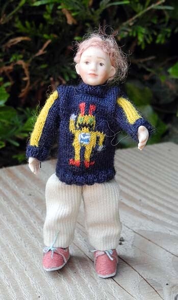 A tough woolen boy's sweater suitable for a doll of 10 cm. On the front of the sweater, a robot is partially knitted and also embroidered. The sleeves of this sweater are nice and tough with their yellow stripes. Dimensions of the sweater: length 4 cm, width 3.3 cm.