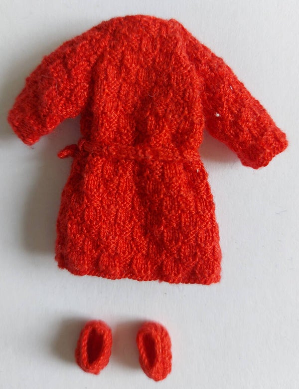 A comfortable bathrobe made of soft cotton with a matching pair of slippers. Length of the bathrobe is 5.2 cm. Doll and toy not included.