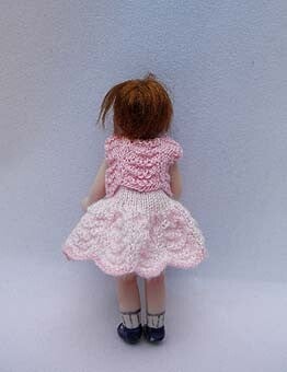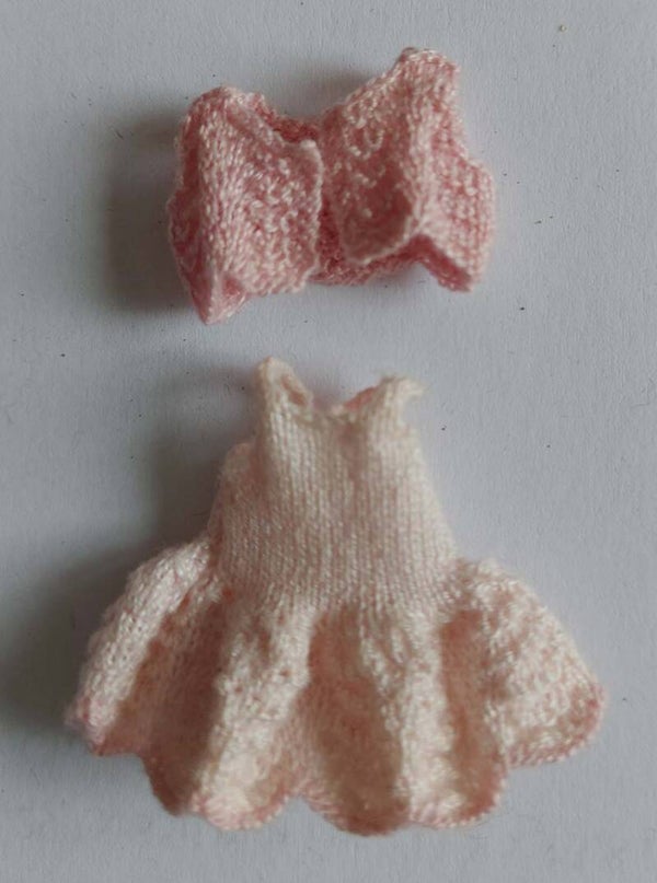 A lovely light pink cotton summer dress with a pink bolero over it. A cute set. The dress is 4 cm long. The doll is not included.