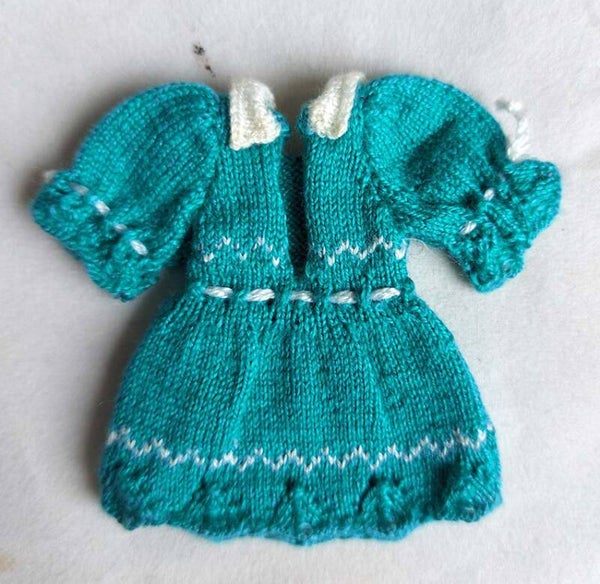 A beautiful classic dress, knitted with fine cotton. The white zigzag is knitted in. There are small bows at the waist and on the sleeves. The white collar completes the look.