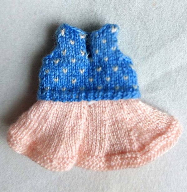 A lovely cotton set, this flowy pink skirt and the dotted blue jumper. Cheerful, sunny, and playful. Doll not included.