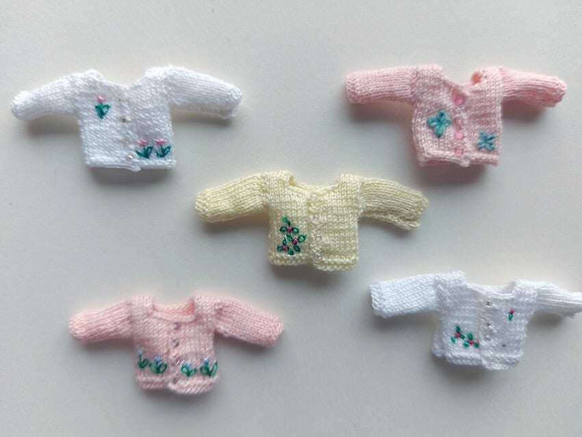 Cute baby cardigan, knitted with thin white cotton. This cardigan can be opened and closed. Small beads serve as buttons. On the front, I made sweet little embroideries. Width 1.9 cm, length 1.9 cm.