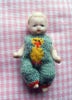 Een lief wollen babypakje met een ingebreid eendje. Dit pakje past een baby van 5-6 cm. Aan de achterkant is een split zodat het pakje makkelijk aangetrokken kan worden. Bij het pakje zit een bijpassend paar slofjes.