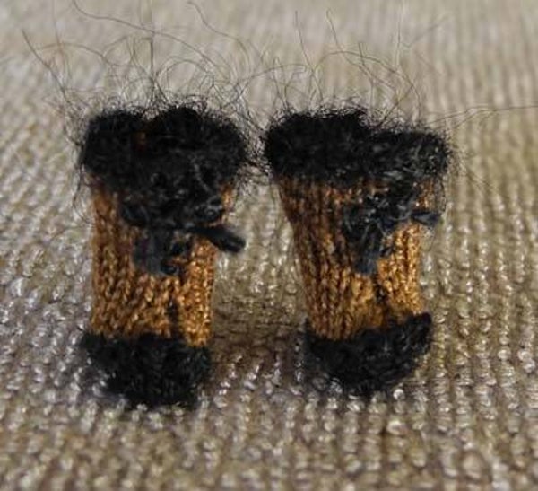 De bruine laarsjes met bontrand zijn ook heel schattig. Deze passen heel goed bij Victoriaanse- maar ook bij moderne kleding. Ook deze laarsjes zijn gebreid met Venne katoen 34/2 en een kaartje Wisper mohair voor de bovenrand. Alle benodigdheden zijn te vinden in de winkel.
