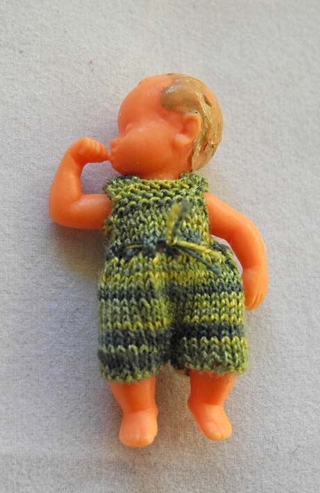 A very cute plastic doll of 3.5 cm. It is sleeping with his thumb in his mouth. It wears a multi green knitted cotton suit.