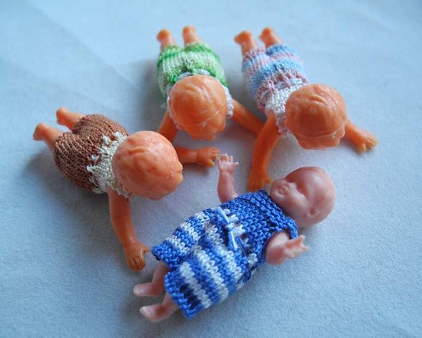 Een klein popje dat op de grond speelt. Het ligt op zijn buik en is 4 cm. Het draagt een veelkleurig lichtblauw-roze gebreid katoenen pakje.
