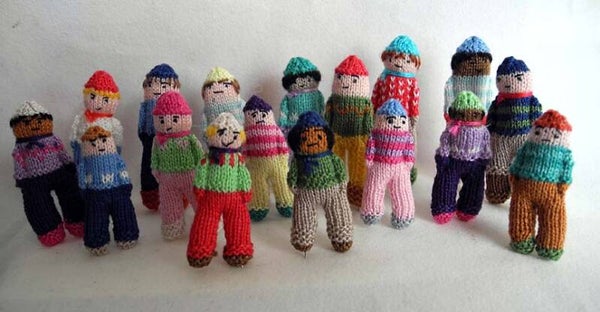 A knitted doll with a sweet face. This doll is 4 cm. It has his hands in his pockets and is nice soft to cuddle.