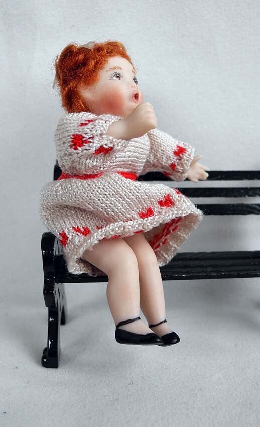 This sweet toddler doll is sitting on a couch. She is made of porcelain and has 2 bows in her hair. She's just about to put her thumb in her mouth. She is wearing a beautiful knitted dress of beige cotton with red hearts knitted in. At the waist she has a red ribbon. The black shoes are painted. Her legs are made in a sitting position. Length 8 cm.