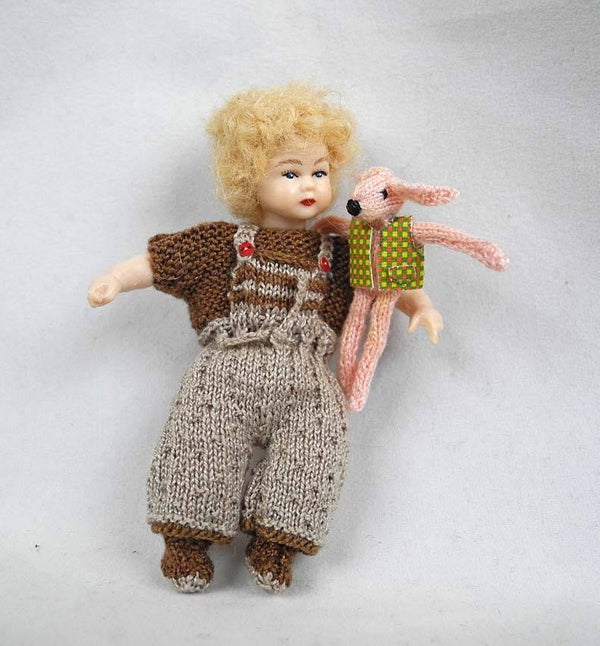 Een vrolijke kleuter met een blonde krullenkop. Het popje is van de firma Heidi Ott. Deze kleuter draagt een beige gebreide tuinbroek en een bruin truitje. Daarbij heeft hij bijpassende beige-bruine slofjes. Lengte 6,8 cm. De knuffel haas hoort er niet bij.