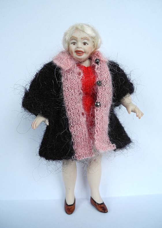 Every time I look at this doll it makes me happy. The doll is made of porcelain and has a beautiful painted face. A curvy, smiley doll. She is wearing a red, hand-knitted, sexy dress. Over it she wears a designer mohair coat in black and pink. Every time you look at this doll she will make your day.