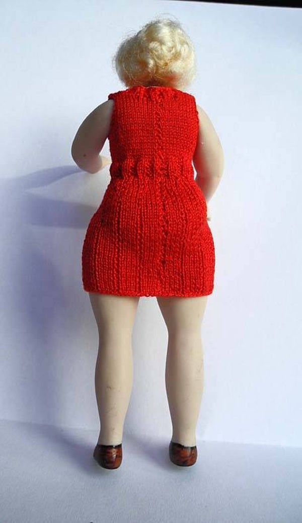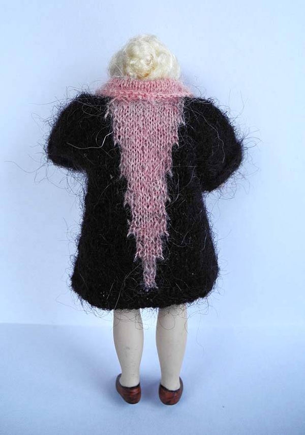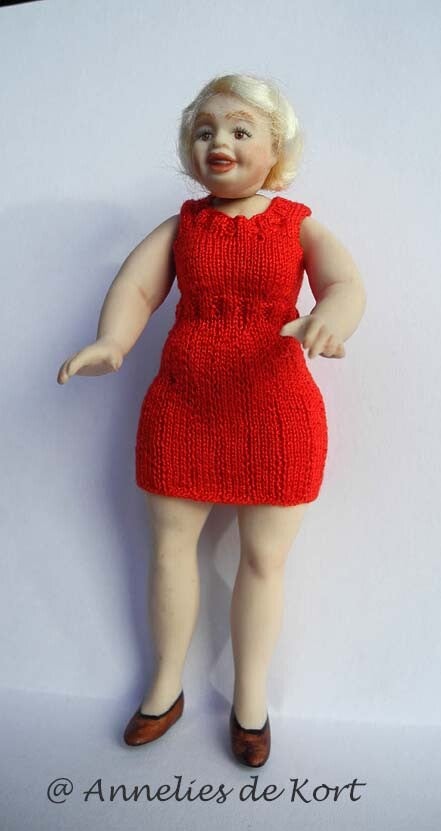 Elke keer als ik naar deze pop kijk word ik weer helemaal blij. De pop is gemaakt van porselein met een mooi beschilderd gezicht. Een wulpse, goedlachse pop. Ze heeft een rood, handgebreid, sexy jurkje aan. Daar overheen draagt ze een mooie mohair jas in zwart met rose. Elke keer als je naar deze pop kijkt maakt ze je dag weer goed.