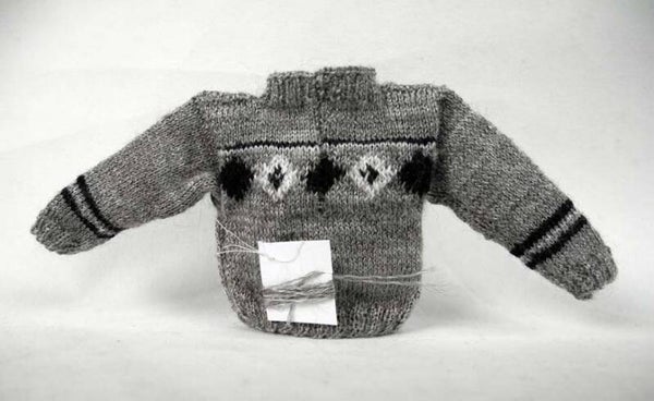 Een prachtige hand gebreide herentrui van dunne grijze wol in een Noors patroon. Stoer, comfortabel en lekker warm. Aan de achterkant is een split zodat de trui makkelijk aangetrokken kan worden. Er is een draadje wol bij in dezelfde kleur als de trui om het split daarna weer te sluiten. Lengte 5,5 cm., breedte 4,5 cm.