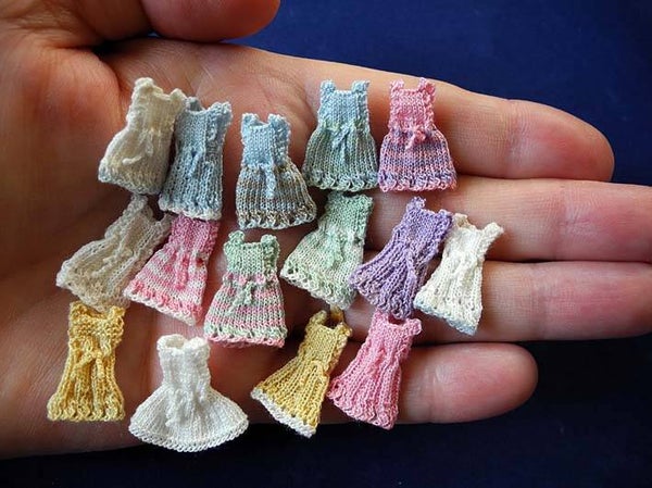 Elegant lilac dress with a lovely fantasy border. Length 22 mm. This dress is hand knitted with very fine cotton on knitting needles of 0.6 mm. With every item 1-48 comes a free cloth hanger.