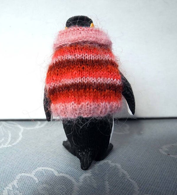 A beautiful penguin from the company Schleich wearing a striped mohair jumper with a collar. Because it's cold at the South Pole. The stripes are from pink to dark red. A lovely jumper! The length of the penguin is 7 cm.