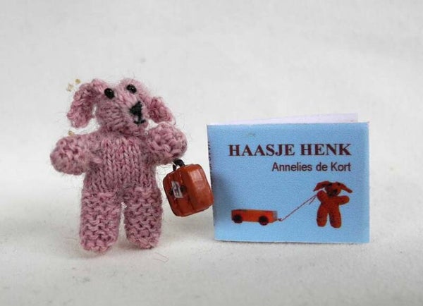 Een heel schattig klein roze haasje met een koffertje. Dit haasje is gebreid met heel dunne wol. Omdat hij op reis gaat heeft hij zijn koffer met reis sticker meegenomen. Dit haasje speelt een rol in het boekje Haasje Henk dat ook in deze shop te koop is. Lengte: slechts 2 cm.