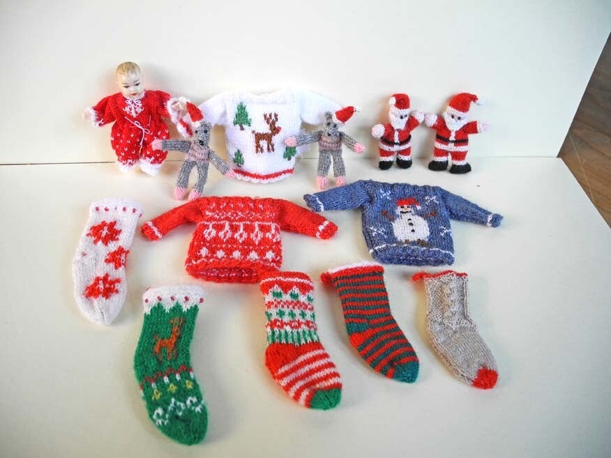 A very nice winter jumper for a doll of 10 cm. The jumper is knitted with thin shetland wool. The snowman is knitted in. There is a split at the back, making the sweater easy to put on. Width 3,6 cm, Length 4,4 cm. With the jumper comes a card with wool to close the split after putting it on the doll.