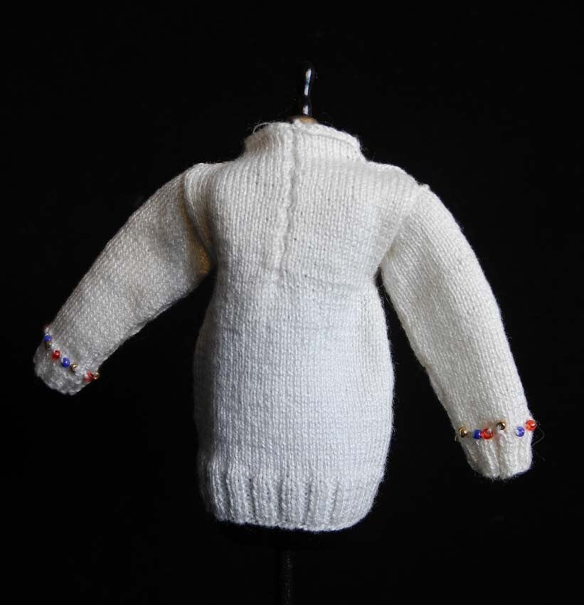 Deze stijlvolle lange trui, of korte jurk, heeft aan de vookant kraaltjes in de vorm van vlinders. De trui is met de hand gebreid. Ook langs de mouwen zijn meegebreide kraaltjes. Heel bijzonder is de mooie v-vormige halslijn. Lengte 6,5 cm Breedte 4,2 cm.