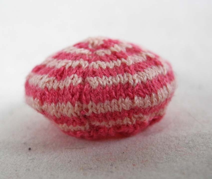 A beret always looks good and is timeless and cheerful. This one is hand-knitted from thin cotton. Diameter at the widest point is 3 cm.